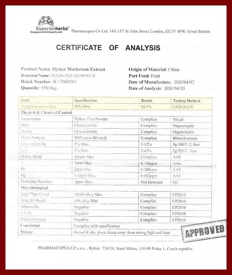 Tento produkt obsahuje kombinaci dvou typů standartizovaných extraktů z hlívy ústřičné doplněnou o extrakt z rakytníku řešetlákového o vysoké synergii a účinnosti. První extrakt z hlívy standardizovaný na obsah 50 % polysacharidů a druhý extrakt z hlívy standardizovaný na obsah 30 % betaglukanů.