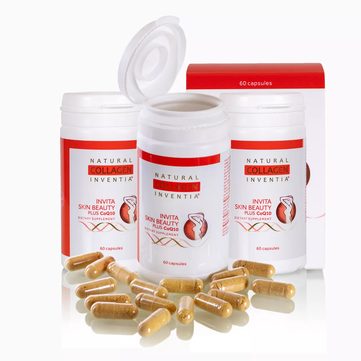 Bioaktivní doplněk stravy Invita Skin Beauty plus CoQ10 – kolagen nové generace v kapslích s jedinečným složením pro udržení krásné a pevné pokožky, pojivových tkání, pružného těla, ohebných kloubů a zdravých vlasů a nehtů. Reprezentuje zcela nový přístup v péči o pokožku a pojivové tkáně lidského těla.